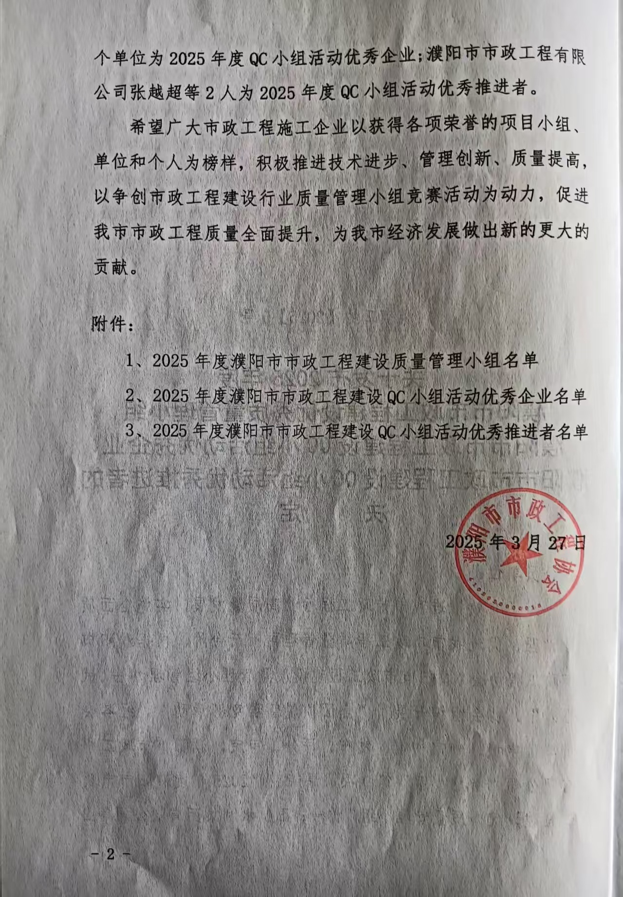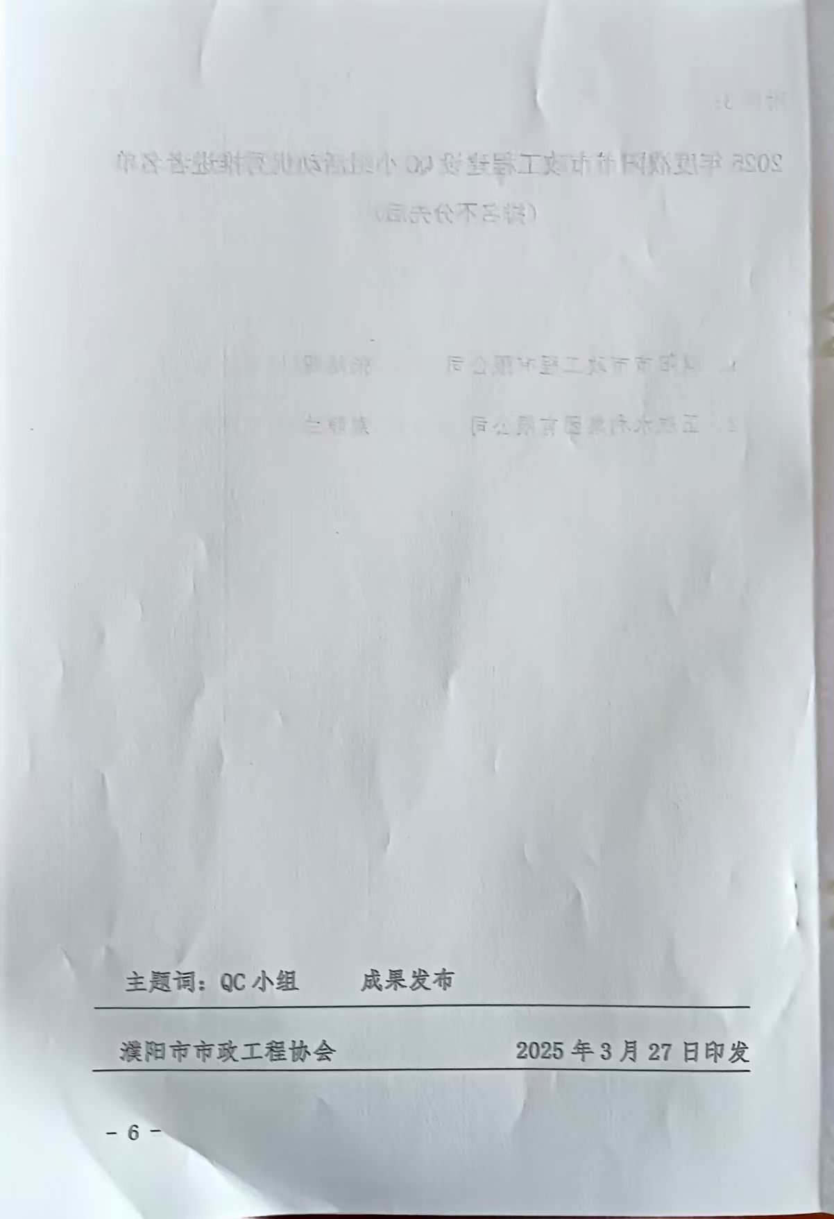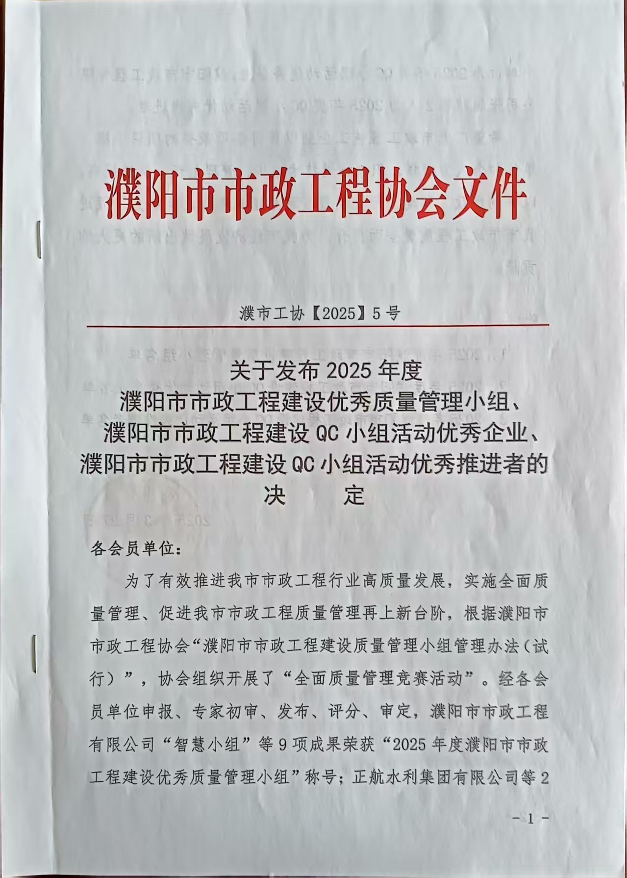 关于发布2025年度濮阳市市政工程建设优秀质量管理小组、濮阳市市政工程建设QC小组活动优秀企业、濮阳市市政工程建设QC小组活动优秀推荐者的决定 濮市工协[2025]5号
