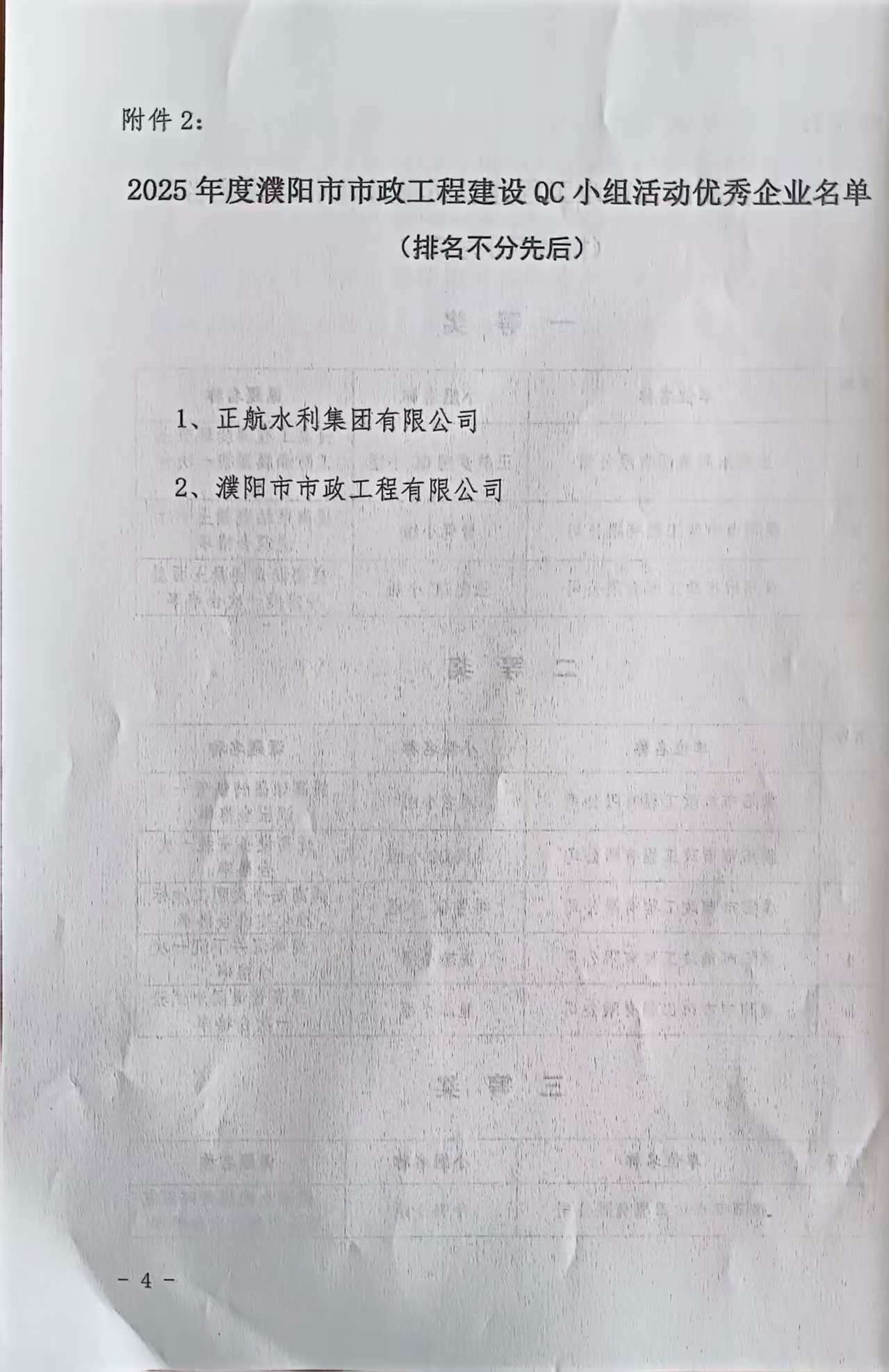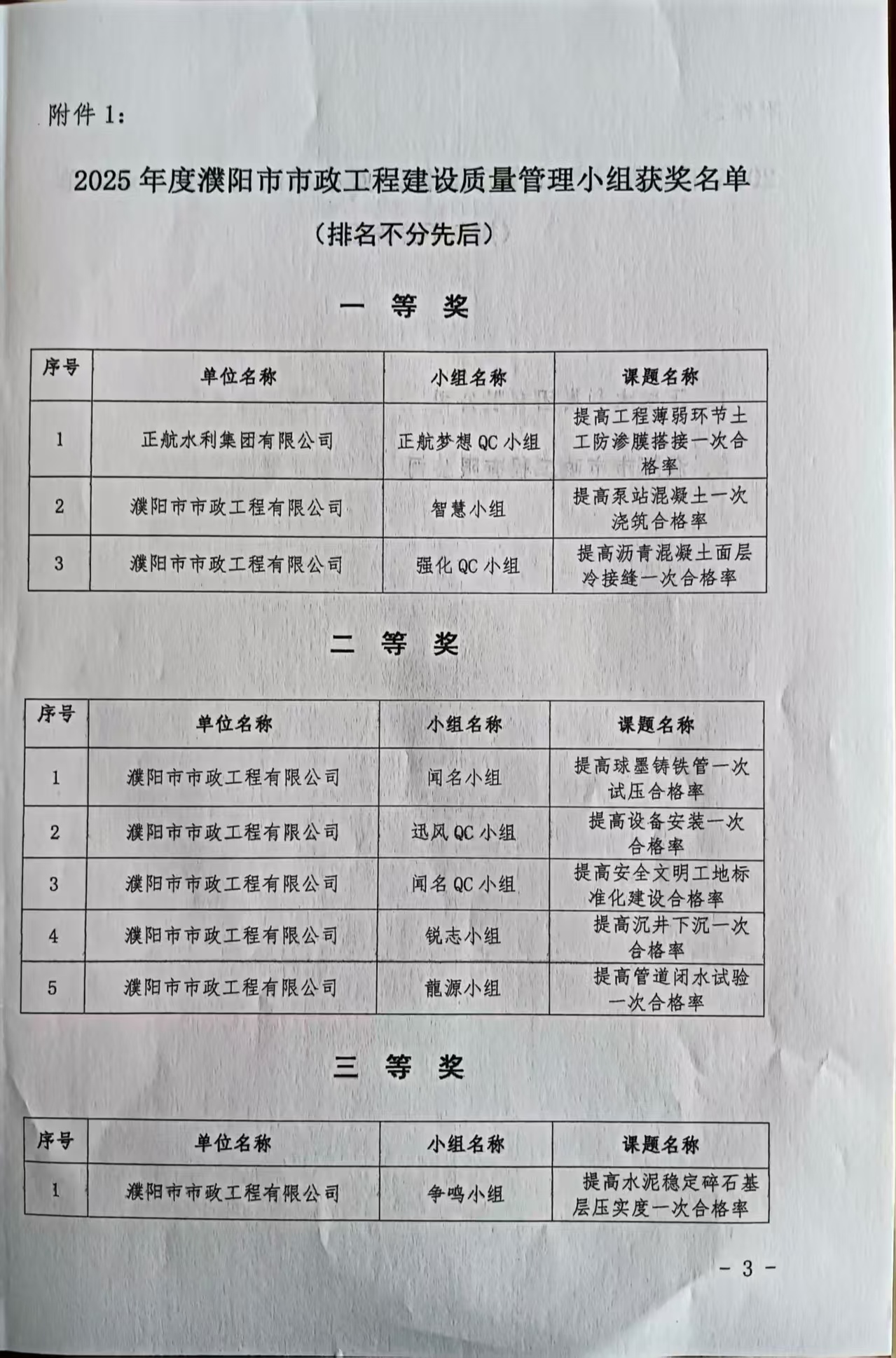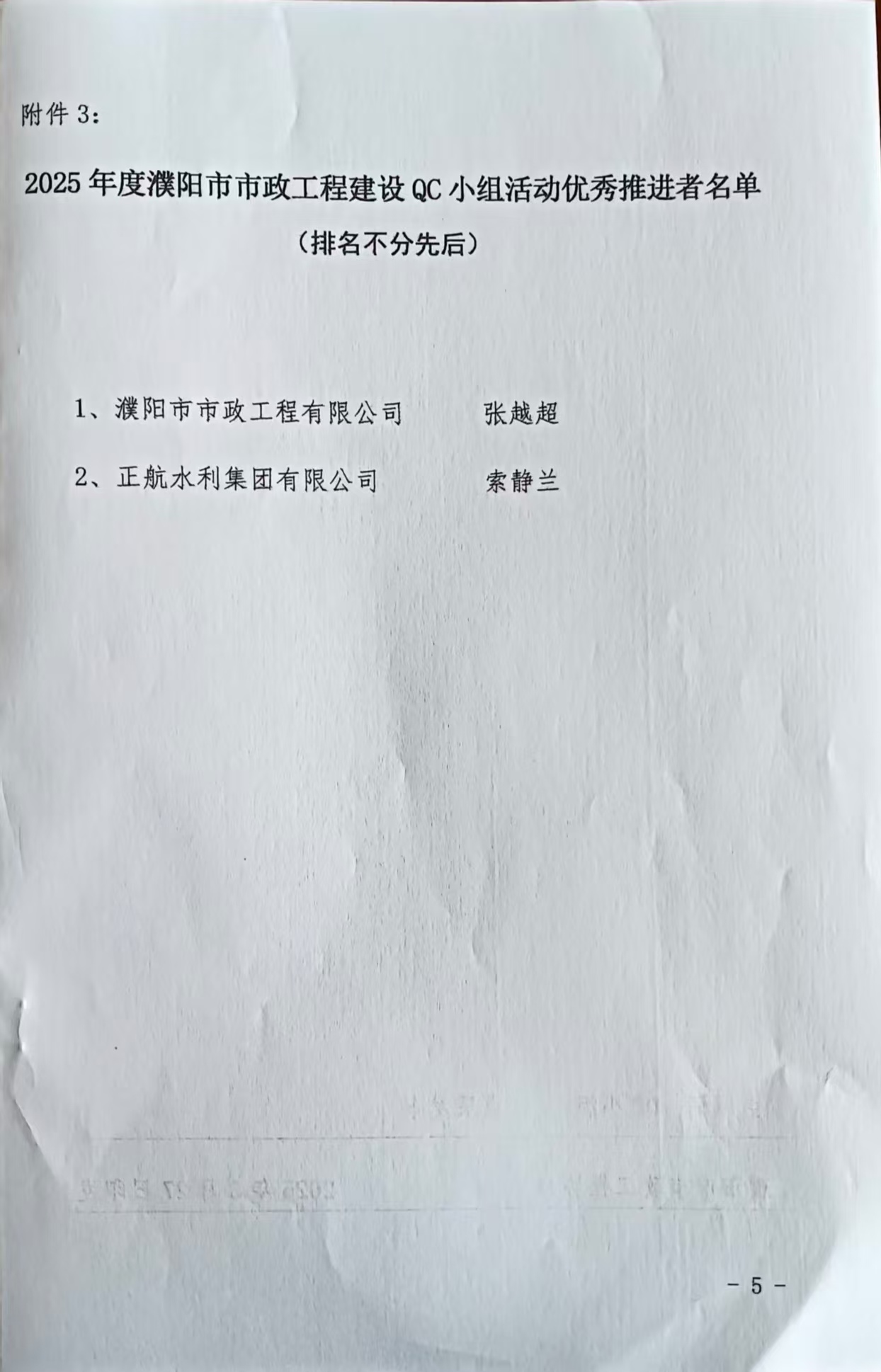 关于发布2025年度濮阳市市政工程建设优秀质量管理小组、濮阳市市政工程建设QC小组活动优秀企业、濮阳市市政工程建设QC小组活动优秀推荐者的决定 濮市工协[2025]5号